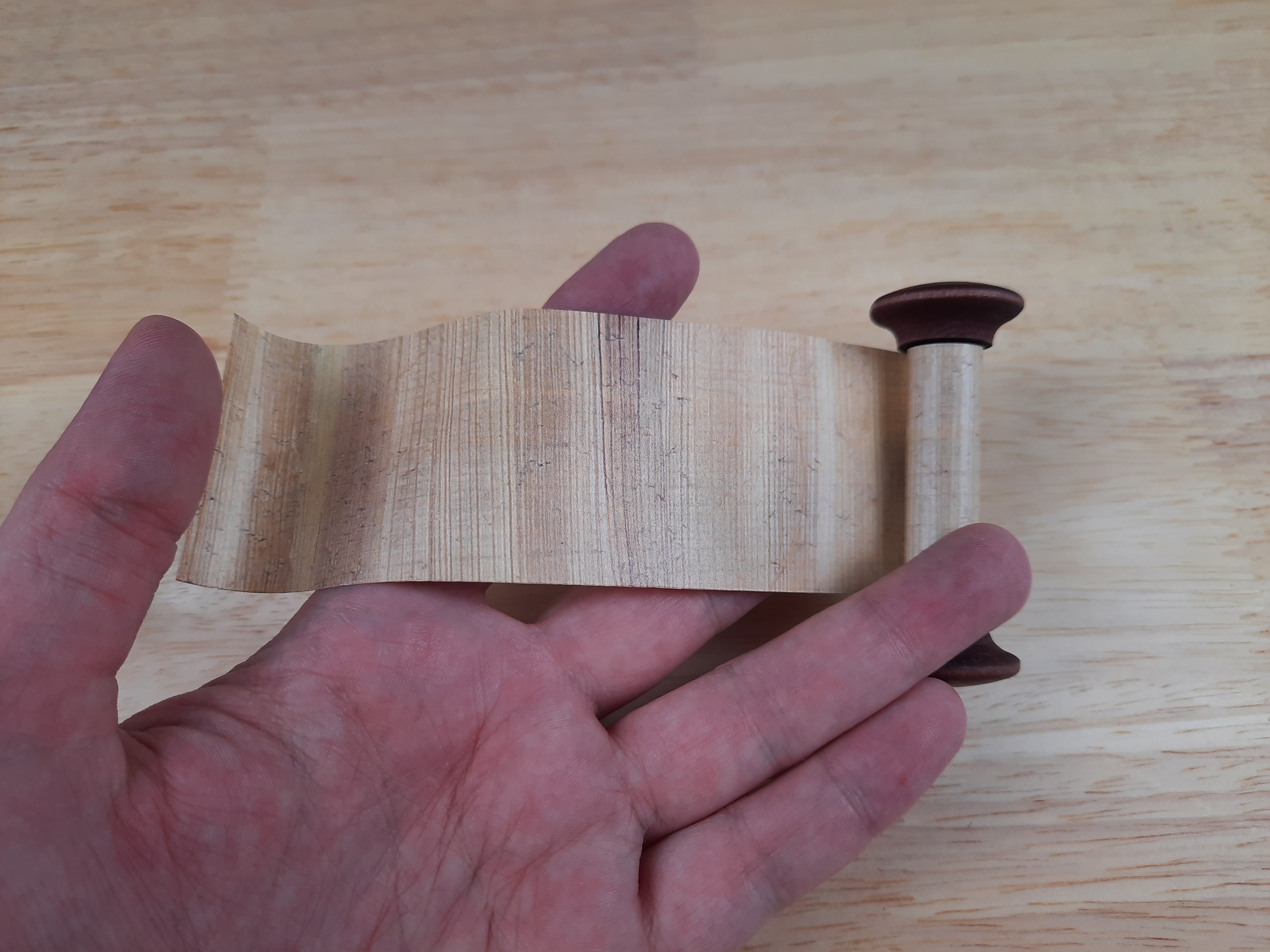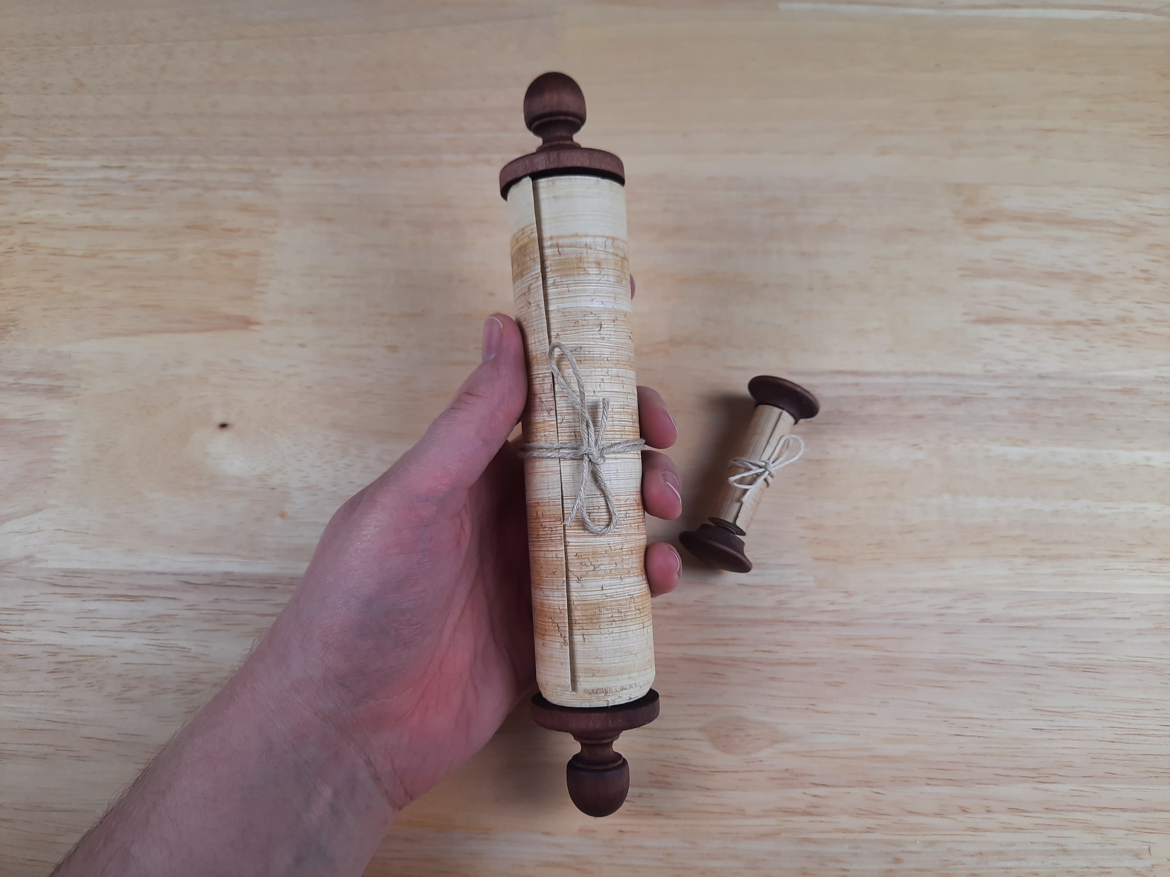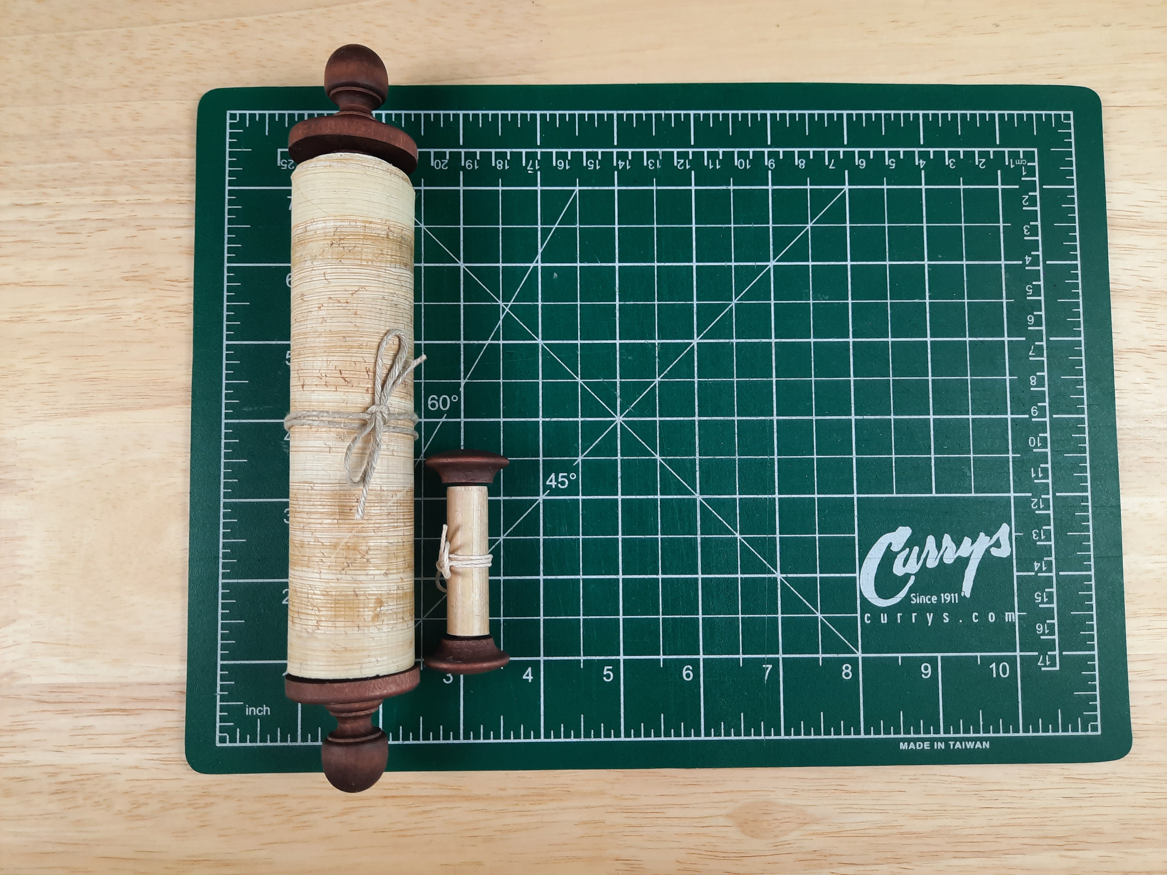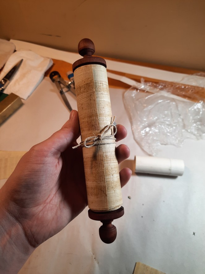 1. How did you attach the papyrus to the wooden umbilicus? I’m making my own scroll example and am having difficulty finding historical information about how best to attach and my papyrus seems very stiff for simply gluing it to on.