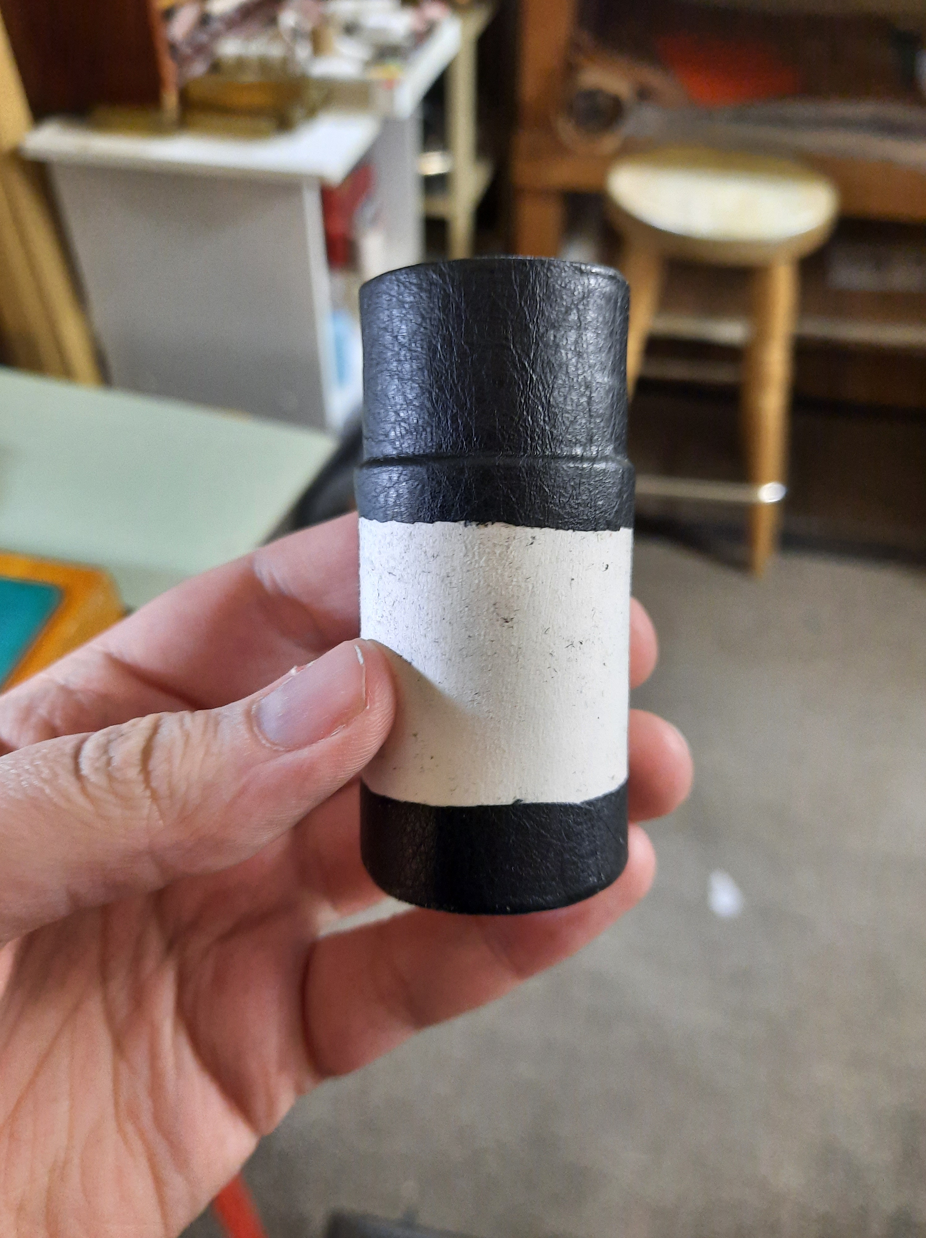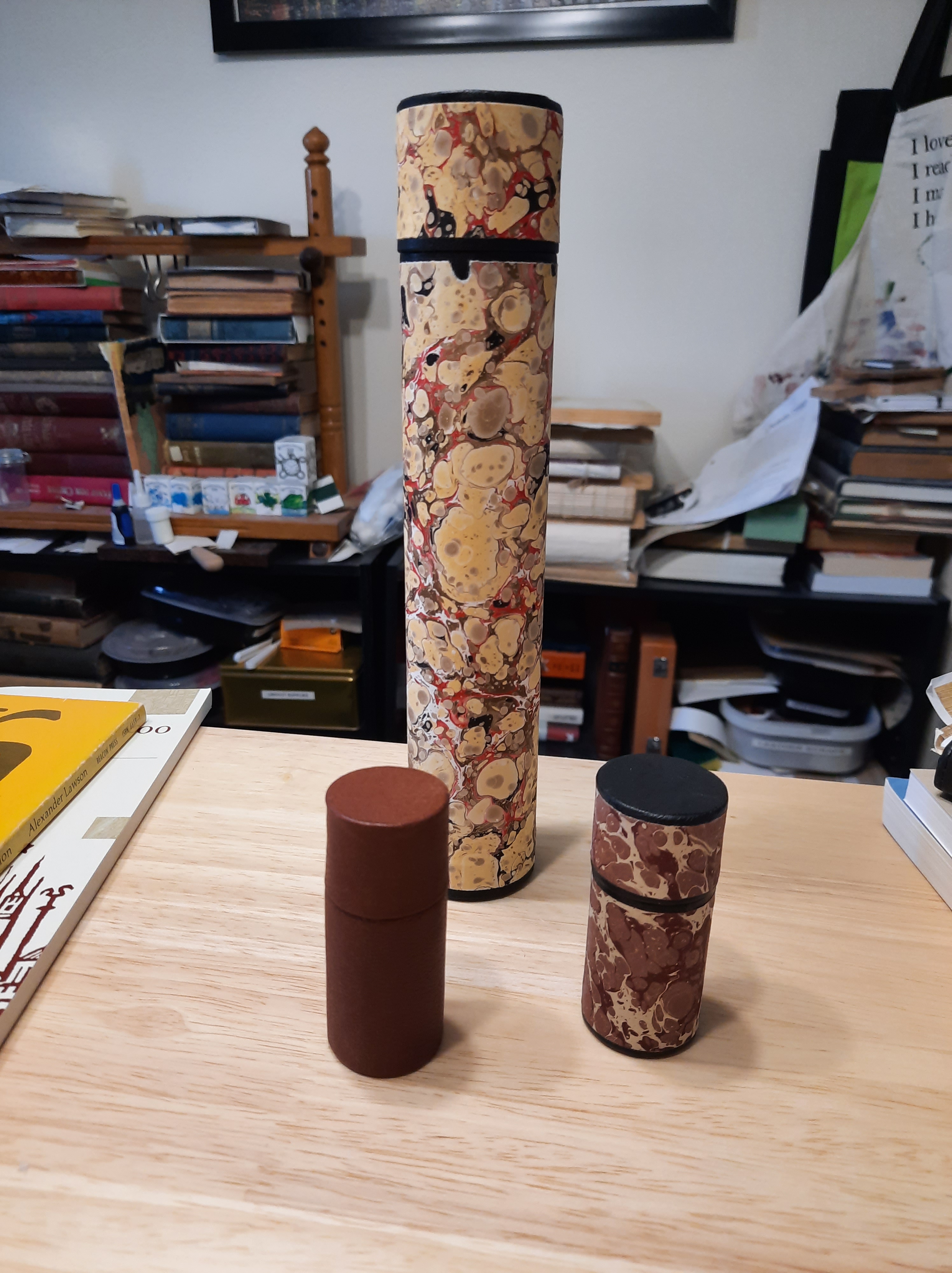 Once all of this is dry it can be removed from the pole. After that a circle of card is added to the top and bottom. We also added a layer of black paper inside to line the tube. Then we added leather. We made two types — a full leather tube, and a tube with leather at the head and tail. The half-leather tube was filled in with marbled paper.